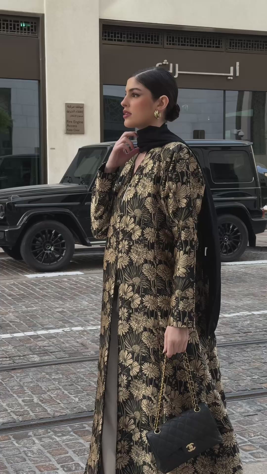Abaya made from lightweight jacquard fabric with an A-line cut, adorned with sunflower motifs.